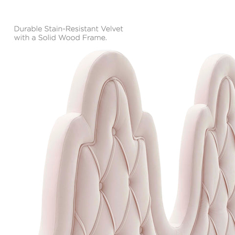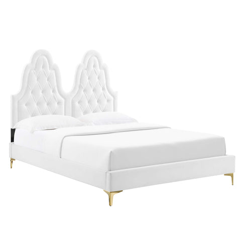 Vintage glamour and regal aesthetics unify on the Alexandria Performance Velvet Twin Platform Bed. A luxurious addition to a guest bedroom or kid's bedroom, the twin headboard on this platform bed features beautiful diamond tufting, French piping detail, and a stunningly unique silhouette. Covered in soft, stain-resistant performance velvet, this upholstered bed is complete with a foam padded headboard granting ultimate comfort and support while sitting up and relaxing in bed. This velvet bed is a sturdy mattress foundation for memory foam, innerspring, latex, and hybrid mattresses. Eliminating the need for a box spring, the MDF frame of this twin size bed is complete with a wood slat support system crafted with poplar for lasting durability and support. This slatted bed frame rests on gold metal legs with non-marking foot caps and includes a reinforced center beam with two support legs for enhanced stability. Assembly required. Weight Capacity: 800 lbs.