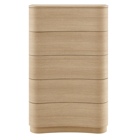 Sculptural lines and vertical storage make the Mirae 5-Drawer Dresser Chest a standout piece for the modern bedroom. Designed with a tall frame and gracefully curved drawer fronts, this upright vertical dresser brings soft edges and visual flow to any space. Smooth wood grain laminate highlights the natural form, while five spacious deep drawers offer plenty of room for clothing, linens, or everyday essentials. Whether styled as a tall dresser in the bedroom, a closet cabinet, or a vertical accent chest in a hallway or guest room, Mirae blends beauty and functionality in a streamlined profile. Assembly required.