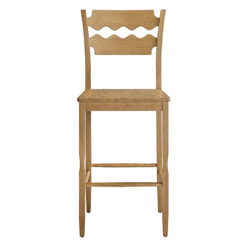 The Jax Single Oak Wood Bar Stool brings a bold, vintage-inspired profile to your space with its unique wavy razor-back. Crafted from solid oak, this wood bar stool stands comfortably at a 29 inch seat height, with the distinct back design giving a quiet nod to vintage bistro barstools. A four-sided stretcher base offers a natural place to rest your feet and keeps the frame feeling steady and supportive, while the armless, open shape keeps the look light and versatile. Jax is a natural fit as a bar height stool for a home bar or as an extra perch around the house. Arriving fully assembled, it comes with non-marking foot pads to help protect your floors. Weight Capacity: 300lbs.