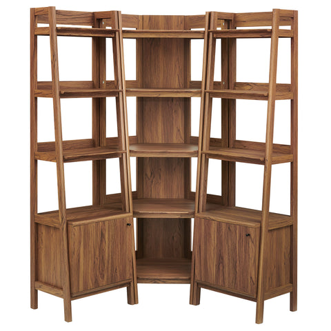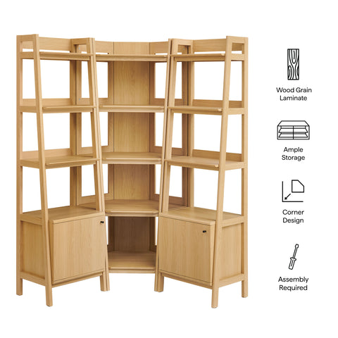 Stack your favorite reads and display décor with this 3-piece Bixby corner bookshelf set. Designed to nest neatly into a corner, the set offers twelve total tiers, combining open shelves with lower cabinets on each side for hidden storage. Laminated wood grain and clean, open lines keep the look balanced and modern, while angled side supports and window-style panels lighten the profile and add stability. Built from a durable wood blend for long-lasting use, the Bixby wide bookcase set serves as a prominent 76 inch wide wall display. Weight Capacity: 141 lbs per shelf.