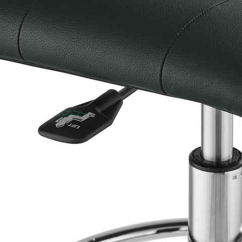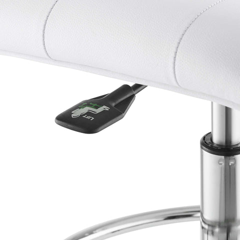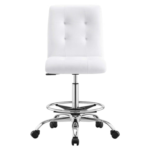 Etiquette presides over the properly styled Prim Armless Drafting Chair. Modern and luxurious, this swivel drafting stool features deep biscuit tufting, durable vegan leather upholstery, and elegant piped trim for added finesse. This vegan leather drafting chair is height adjustable, features a 360º swivel, and comes outfitted with a chrome metal base with five dual-wheel nylon casters. Perfect for standing desks, drafting tables, reception desks, and more, this drafting-height office chair is complete with dense foam padding for lasting comfort throughout the workday. Assembly required. Weight Capacity: 287 lbs.