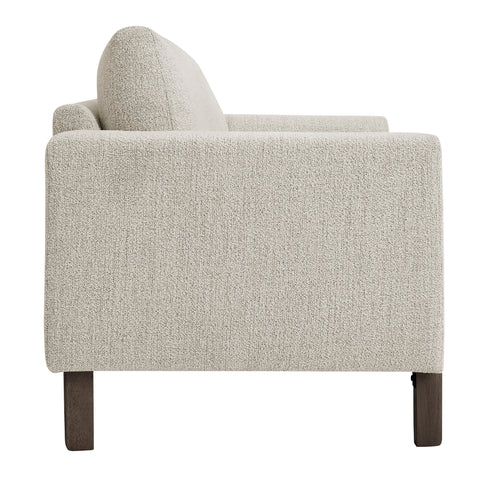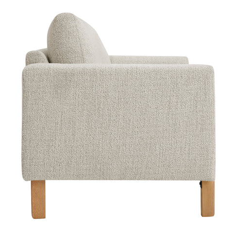 Settle into sculptural comfort with the Hawken Boucle Fabric Upholstered Loveseat. Designed with bold curves and oversized proportions, this two-seater sofa offers a wide, inviting seat and gently sloped armrests for a cozy reading or relaxation experience. Upholstered in soft brushed boucle fabric, Hawken adds depth and visual warmth to any space—from living room to bedroom to office lounge. The sturdy solid wood legs complement the textured boucle upholstery with natural warmth and mid-century charm. With a supportive foam-padded seat, plush back cushions, and zigzag spring suspension, this modern loveseat delivers everyday comfort with timeless style. Assembly required. Weight Capacity: 500 lbs.