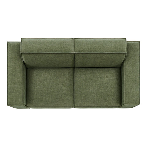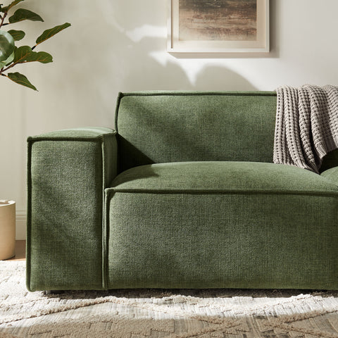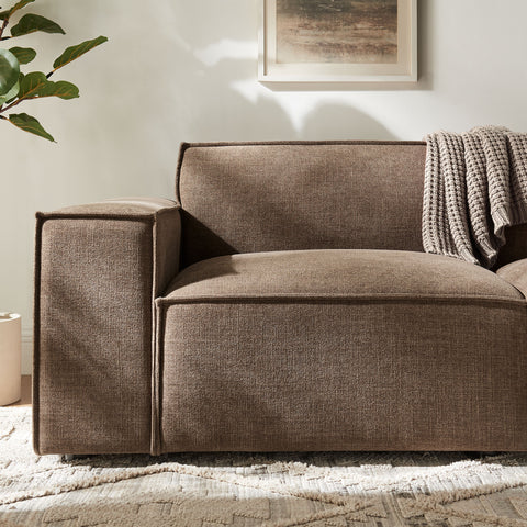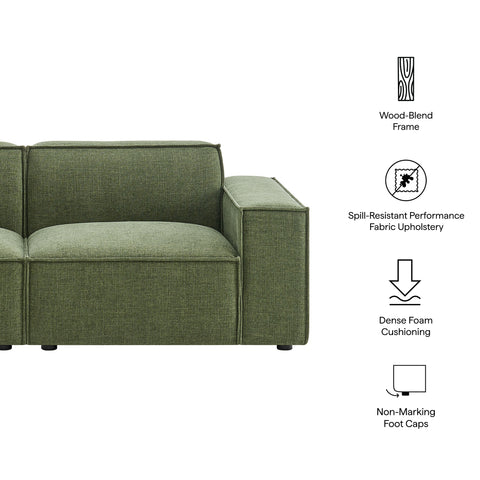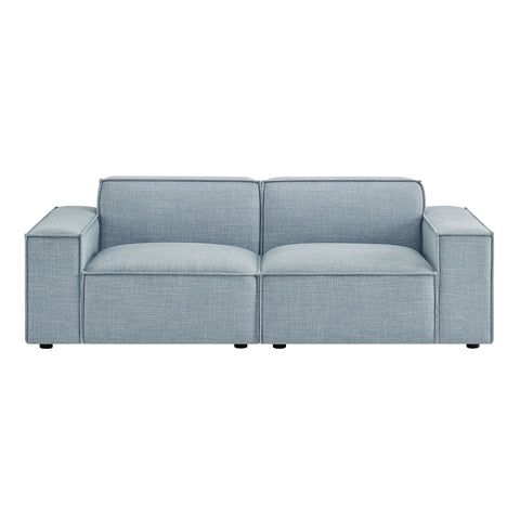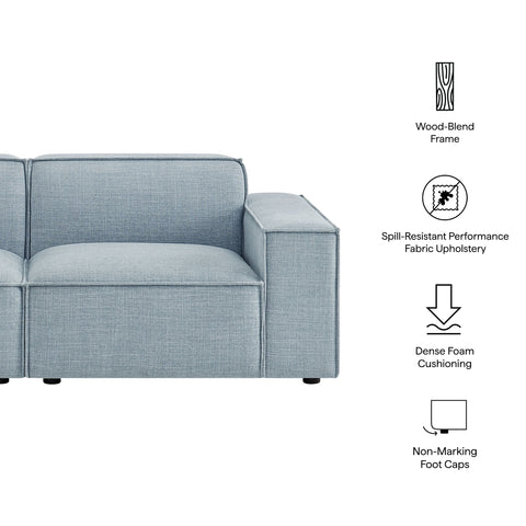 Create your custom living room and lounge area with the Restore Upholstered Fabric 2-Piece Sectional Sofa. The Restore Sectional Sofa appeals to minimalist elegance with a crisp design and broad lines accented with French piping details and soft fabric upholstery. Featuring a high-performance upholstery fabric designed to repel water-based spills and stains—most messes blot away easily with a clean cloth. For stubborn residue, spray with a diluted dish soap solution and blot clean. Dense foam padding and a pocket coil spring system in the cushions offer a luxe seating experience for your living room and lounge. Built on a sturdy wood-blend frame with non-marking foot caps to help protect floors, this modular loveseat can stand on its own or connect easily to other Restore pieces using the built-in connectors.