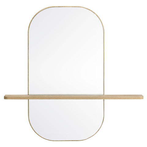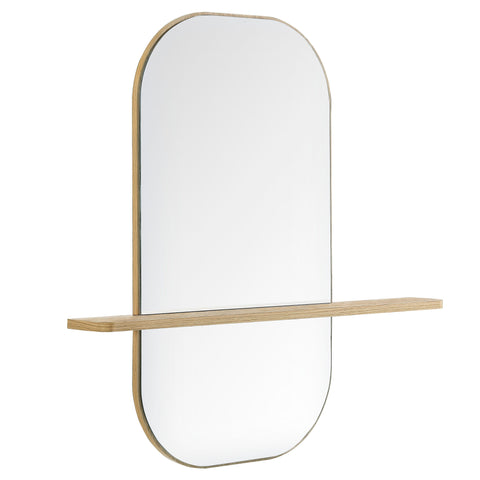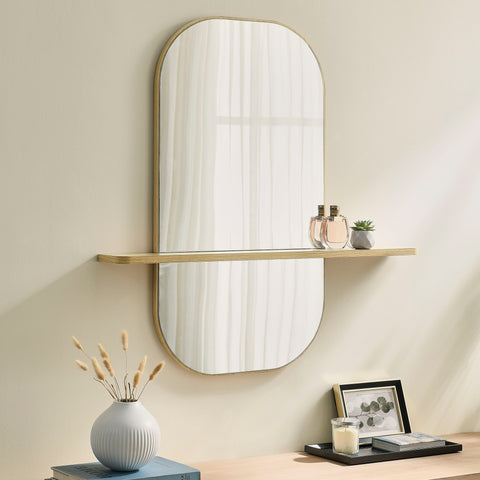 The Solstice Oval Mirror adds an air of sophistication to any space. A good blend of contemporary and traditional styles, this oversized rectangular mirror features rounded edges and a split design, making it the ideal decorative accent for an entryway or mudroom, living area, bedroom, bathroom, or vanity space. Crafted from particleboard with a wood grain laminate, this long wall mirror is designed to last for years and is sure to add a touch of elegance to any interior. An added shelf is great for storing small items such as keys, personal care items, and other small accessories. With only minimal assembly required, this wall mirror is sure to be a beautiful addition to any home.