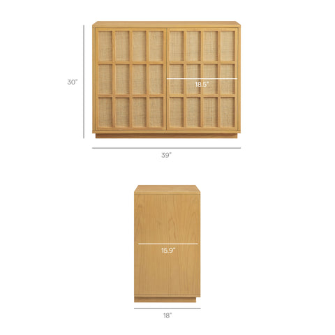 The Aiko 39 Inch Japandi Accent Cabinet is an easy, stylish way to add extra storage without taking up too much space. Crafted with a wood frame and ash wood veneer, this two-door cabinet features woven panel door fronts in a geometric grid pattern with push-to-open doors for a smooth, hardware-free look. With one adjustable shelf and one fixed shelf, it offers easy storage for serveware, glassware, books, or bar essentials. Style it as a hallway cabinet, liquor cabinet, or a living room accent hutch for a calm, pulled-together look. Its minimalist Japanese style brings a calm, clean look to dining rooms, hallways, or living spaces while adding everyday storage. Well suited to coastal and relaxed modern interiors, Aiko includes non-marking floor glides to help protect floors. Assembly required. Weight Capacity: Top : 132lb, Top Shelf : 57lb, Bottom Shelf : 57lb