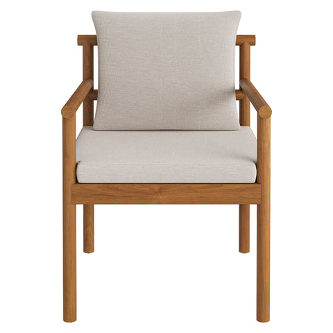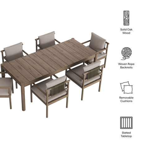 Made for open-air meals, the Eleni Outdoor Teak Wood Dining Set brings a warm coastal presence to patios and decks. Crafted from solid teak that showcases the wood’s natural grain, the 89-inch rectangular table pairs with six armchairs for an easy, gathered look. Each chair features a woven rope accent at the top of the backrest, while the upholstered seat and back cushions that hold their shape through sun and showers. The table’s slatted top promotes airflow and quick drainage, while rounded posts keep the silhouette clean and sturdy. Non-marking foot caps on both table and chairs help protect decking and stone. Simple assembly required
