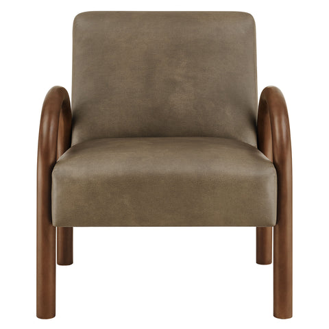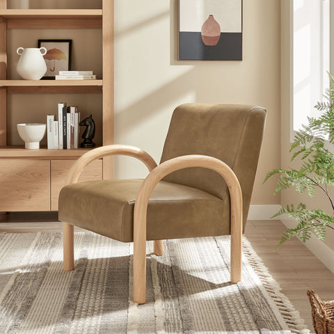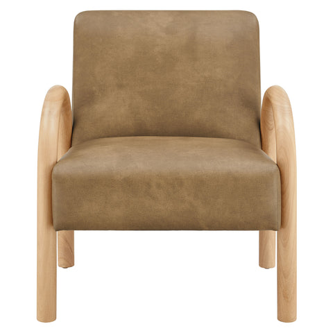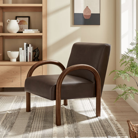 Elevate your space with the sculptural charm of the Lunet Accent Chair. Wrapped in smooth faux leather, this upholstered armchair pairs cozy texture with a bold wood frame for a look that’s both modern and timeless. The distinctive arched armrests curve seamlessly into solid wood legs, creating a statement silhouette that feels warm yet refined. High resiliency foam padding and a gently reclined seat make this vegan leather lounge chair as inviting as it is stylish—perfect for curling up with a book, adding flair to a living room corner, or anchoring a bedroom reading nook. Outfitted with non-marking floor glides, Lunet balances comfort, durability, and design in one plush package. Assembly required. Weight Capacity: 300 lbs.