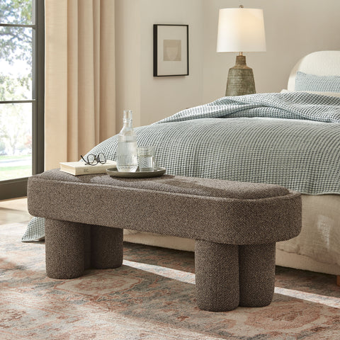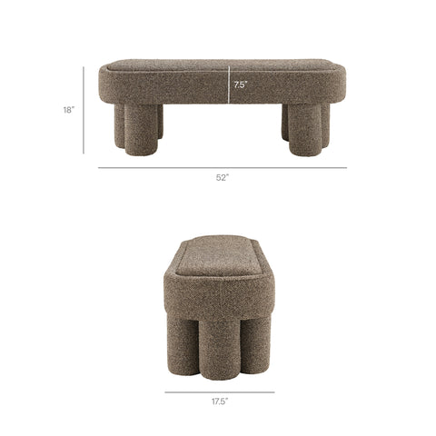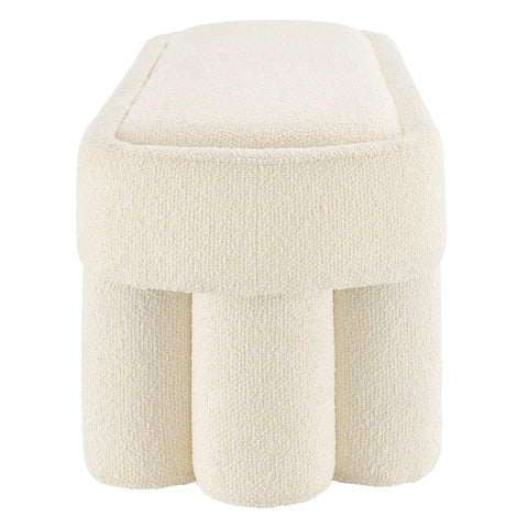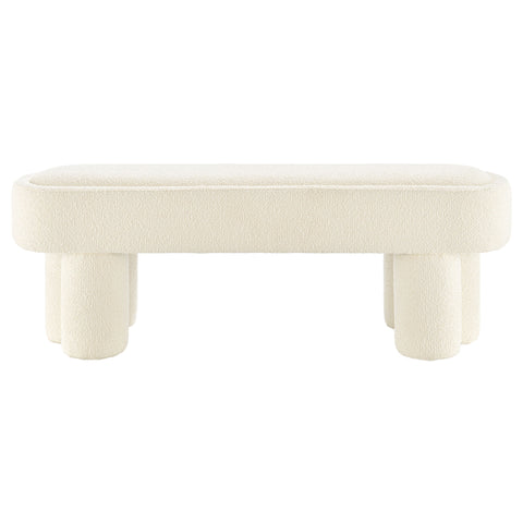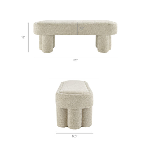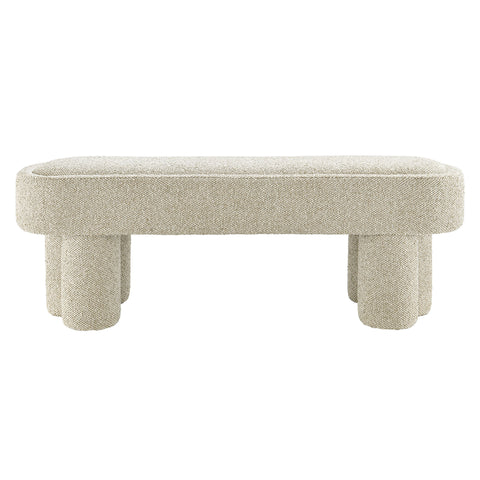 Soft curves and bold geometry define the Mossi Fabric Bench, a modern accent piece with sculptural appeal. Upholstered in boucle fabric, this 52-inch oval bench has a nubby, textured look and an inset seat cushion for added comfort. Resting on cylindrical legs resembling a clover-like base, Mossi makes a striking design statement while providing sturdy support. Whether styled at the end of a bed, in an entryway, or as a lounge bench in the living room, this upholstered boucle bench combines practicality with contemporary artistry. Weight Capacity: 300 lbs.