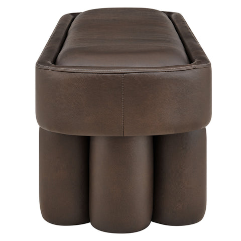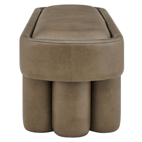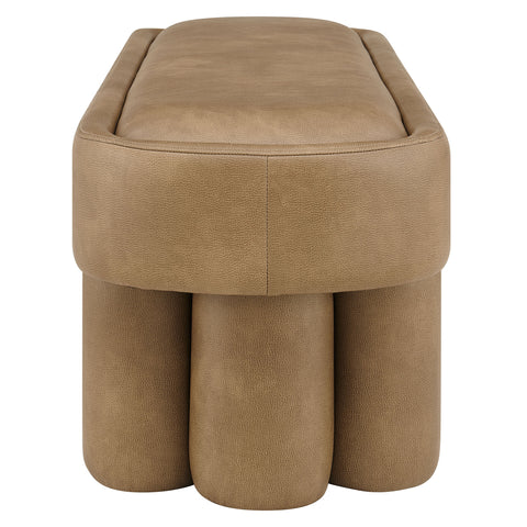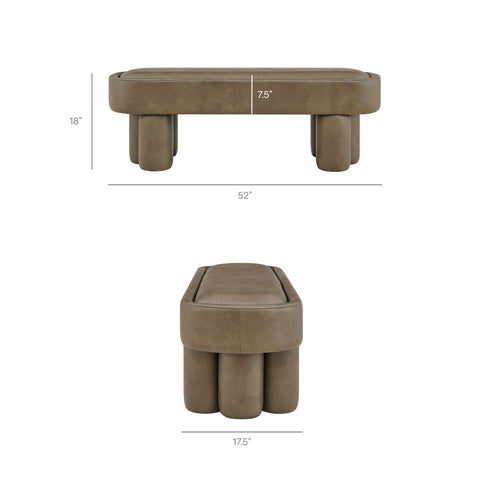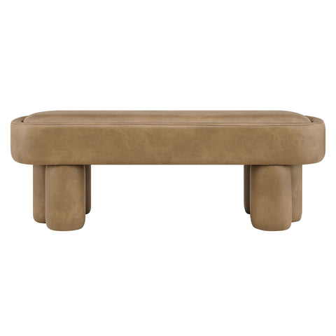Soft curves and bold geometry define the Mossi Vegan Leather Bench, a modern accent piece with sculptural appeal. Upholstered in vegan leather, this 52-inch oval bench has a smooth, tailored look and an inset seat cushion for added comfort. Resting on cylindrical legs resembling a clover-like base, Mossi makes a striking design statement while providing sturdy support. Whether styled at the end of a bed, in an entryway, or as a lounge bench in the living room, this faux leather bench combines practicality with contemporary artistry. Weight Capacity: 300 lbs.