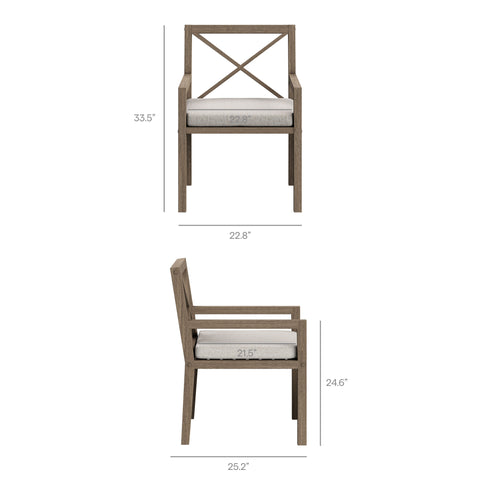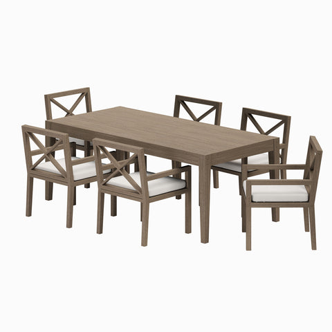 Soak in nature’s beauty with the Northlake 7-Piece Outdoor Patio Dining Set, featuring a spacious dining table and six matching armchairs. All crafted from durable teak wood, the 83-inch rectangular table showcases clean lines and a smooth plank-style top, creating a modern yet timeless setting for outdoor dining. The coordinating armchairs are designed with distinctive cross-back frames for added support and a refined aesthetic. Each patio chair includes a plush, all-weather cushion that is water-resistant, fade-resistant, and quick-drying for lasting comfort, while slatted seat bases encourage airflow and durability. Perfect for patios, decks, and garden gatherings, this teak patio dining set blends elegant craftsmanship with lasting outdoor performance. Includes non-marking floor glides for added protection. Assembly required.