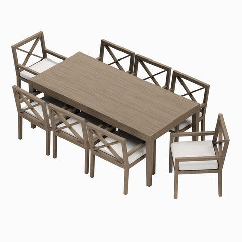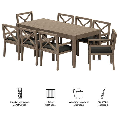 Soak in nature’s beauty with the Northlake 9-Piece Outdoor Patio Dining Set, featuring a spacious dining table and eight matching armchairs. All crafted from durable teak wood, the 83-inch rectangular table showcases clean lines and a smooth plank-style top, creating a modern yet timeless setting for outdoor dining. The coordinating armchairs are designed with distinctive cross-back frames for added support and a refined aesthetic. Each patio chair includes a plush, all-weather cushion that is water-resistant, fade-resistant, and quick-drying for lasting comfort, while slatted seat bases encourage airflow and durability. Perfect for patios, decks, and garden gatherings, this teak patio dining set blends elegant craftsmanship with lasting outdoor performance. Includes non-marking floor glides for added protection. Assembly required.