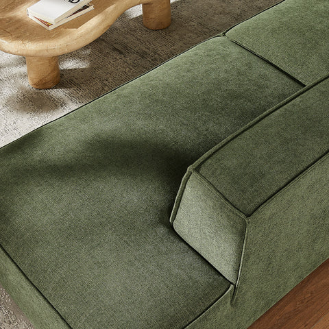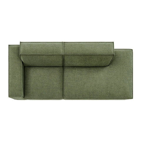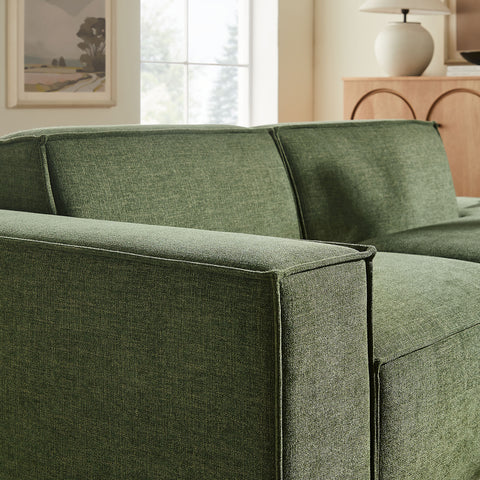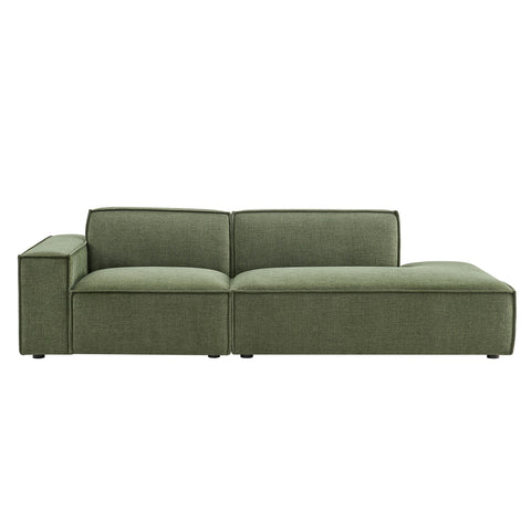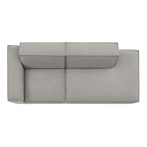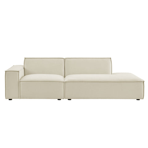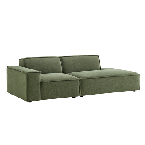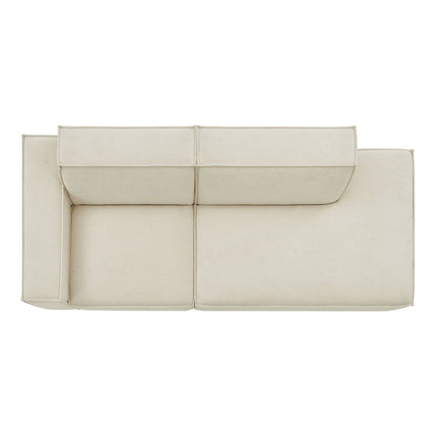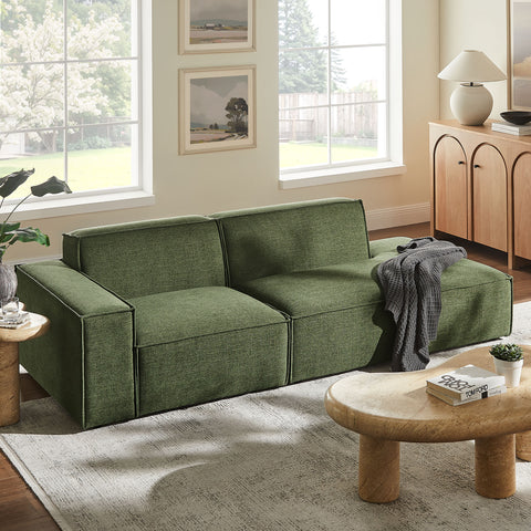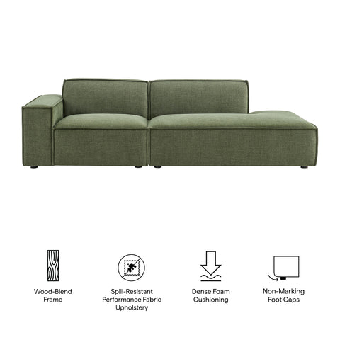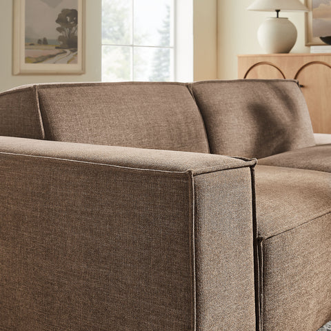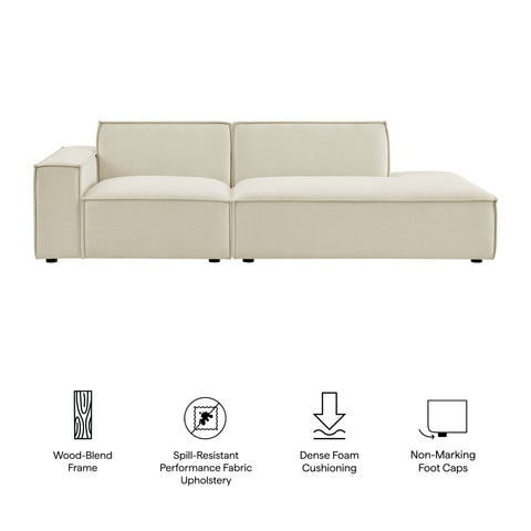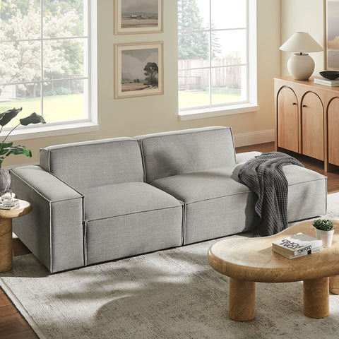 Create your custom living room and lounge area with the Restore Upholstered Fabric Modular Loveseat. The Restore Sectional Couch brings minimalist appeal with a crisp silhouette, broad lines, and French piping details wrapped in soft fabric upholstery. Featuring a high-performance upholstery fabric designed to repel water-based spills and stains—most messes blot away easily with a clean cloth. For stubborn residue, spray with a diluted dish soap solution and blot clean. Dense foam padding and a pocket coil spring system in each seat offer a comfortable, supportive feel for everyday lounging. Designed as a compact loveseat setup, this 2-piece set includes one left-facing armchair and one right-facing armless chaise, creating a relaxed layout that works well in smaller living spaces. Built-in connectors keep the pieces aligned and make it easy to expand over time with other Restore pieces. Built on a sturdy wood-blend frame with non-marking foot caps to help protect floors.