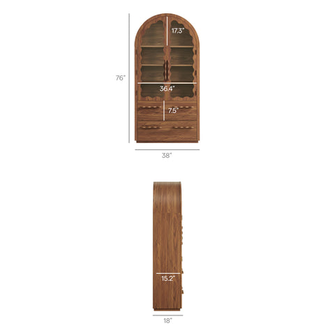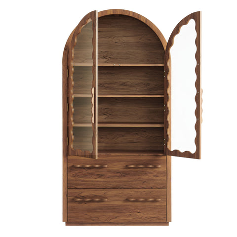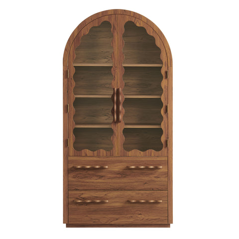 Framed by a softly rounded arch and detailed with scalloped glass doors, the Rory Kitchen Pantry Accent Cabinet brings a warm, handcrafted feel to everyday storage. Made from a laminated wood blend with retro-inspired edging and sculpted handles, this tall cabinet has a whimsical look, while the interior offers a practical mix of two fixed shelves, two adjustable shelves, and spacious lower drawers for linens, dishes, or favorite keepsakes. Standing at 76 inches tall, Rory is designed either as a dining room buffet storage cabinet, living room display stand, decorative hallway cabinet, kitchen pantry cabinet, or large bookcase. With straightforward assembly, this versatile cabinet quickly becomes a hardworking anchor wherever you place it. Weight Capacity: Adj Shelf : 88lb x 2, Fixed Top : 176lb, Shelf Bottom : 88lb, Drawer : 22lb x 2