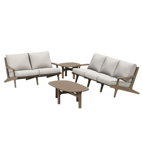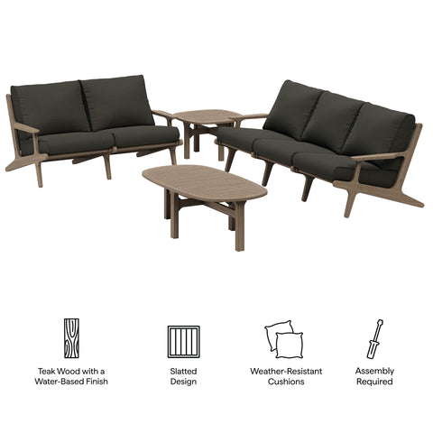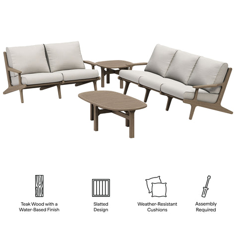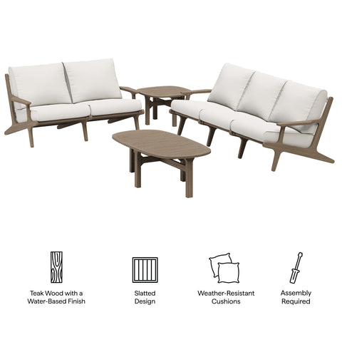 Refresh your outdoor space with the Saratoga 4-Piece Patio Furniture Set. Expertly crafted from durable teak wood with a water-based finish that highlights its natural grain, this backyard furniture set includes a sofa, loveseat, side table and coffee table. The sofa and loveseat feature an angular frame with sculpted armrests, slatted seat foundations, and plush seat and back cushions covered in weather-resistant, water-resistant, and stain-resistant fabric for easy maintenance and year-round relaxation. The coffee and side tables boast beautifully slatted tops with intersecting stretcher bases, offering both durability and a refined silhouette. Perfect for patios, and outdoor lounge areas, the Saratoga 4 Piece Patio Set blends modern design with timeless craftsmanship. Assembly required.