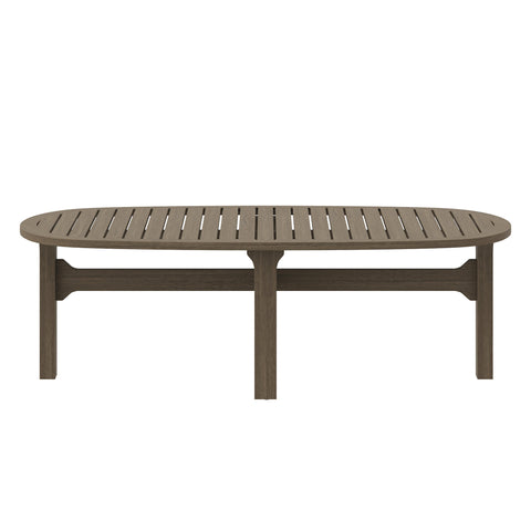 Refresh your al fresco space with the Saratoga Outdoor Patio Coffee Table. Expertly crafted from sturdy teak with a water-based finish that showcases the beautiful wood grain, this oval wood coffee table features a beautifully slatted top for lasting durability and a timeless aesthetic. The base is designed with intersecting stretchers, offering both structural support and a refined silhouette. Perfect for outdoor entertaining, lounging, or as a stylish low table for sitting on the floor, the Saratoga Teak Coffee Table enhances any patio, deck, or garden setting. Includes non-marking floor glides for added stability and surface protection. Weight Capacity: 123 lbs.