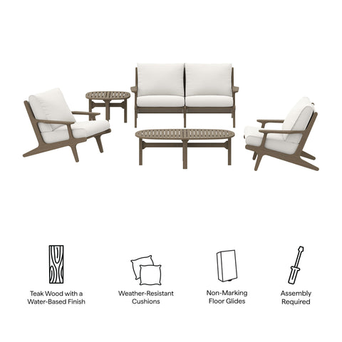 Refresh your outdoor space with the Saratoga 5-Piece Patio Furniture Set. Expertly crafted from durable teak wood with a water-based finish that highlights its natural grain, this backyard furniture set includes a loveseat, two lounge chairs, a coffee table, and a side table. The loveseat and lounge chairs feature an angular frame with sculpted armrests, slatted seat foundations, and plush seat and back cushions covered in weather-resistant, water-repellent, and stain-resistant fabric for easy maintenance and year-round relaxation. The coffee and side tables boast a beautifully slatted top with an intersecting stretcher base, offering both durability and a refined silhouette. Perfect for patios, porches, and outdoor lounge areas, the Saratoga 5 Piece Patio Set blends modern design with timeless craftsmanship. Assembly required.