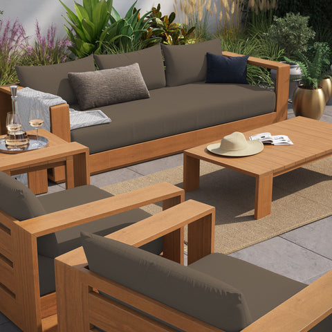 Enliven your alfresco spaces with the Tahoe 5-Piece Outdoor Furniture Set. This modern outdoor patio set is constructed with FSC-certified acacia wood, blending seamlessly into your outdoor lounge spaces. Featuring two lounge chairs, a sofa, a coffee table, and a side table, this 5-piece deck furniture set is ideal for poolside lounging or as chic balcony furniture. Dense foam padding on the lounge chairs and sofa ensure sustained comfort, while the UV and water-resistant cushion covers make it ideal before and after a dip. The removable cushions render this outdoor patio furniture set low maintenance and high performing. Practically designed, the coffee table and side table work well in the rain thanks to the slatted tops that helps keep them dry and puddle-free. An accommodating all-weather acacia patio set, Tahoe is perfect for outdoor relaxing and entertaining. This durable 5-piece set features non-marking foot glides to protect your deck or patio floor and comes with easy-to-follow assembly instructions. Set Includes: 2 Lounge Chair, 1 Sofa, 1 Coffee Table, 1 Side Table. Weight Capacity: Lounge Chair: 500 lbs; Sofa: 800 lbs; Coffee Table: 265 lbs; Side Table: 198 lbs.