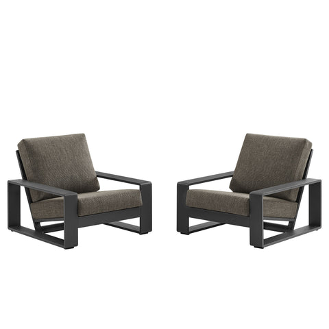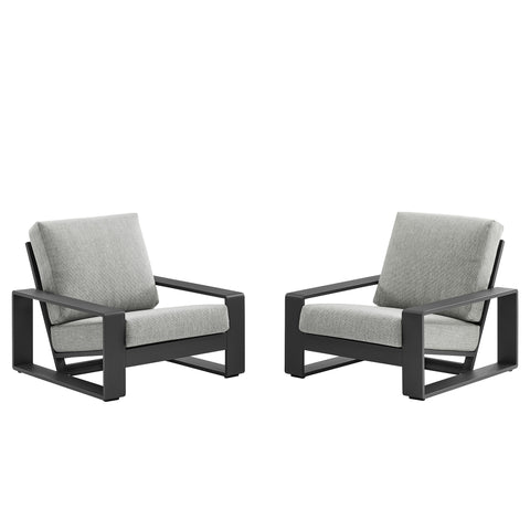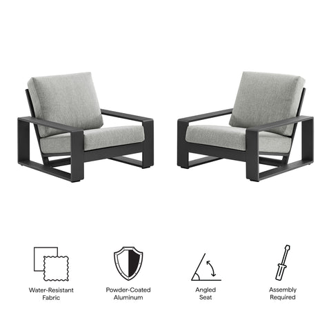 Unwind in sculptural sophistication with the Lirienne Outdoor Patio Armchair Set. Designed for modern relaxation, these two matching outdoor chairs showcase sleek, rectangular frames crafted from durable powder-coated aluminum, offering both resilience and style. The deep, angled seats and plush foam cushions invite you to sink into comfort, while the fabric upholstery is stain-resistant, weather-resistant, and easy to maintain with removable, washable covers. Perfect for lounging on a sun-drenched deck, cozy balcony, or shaded patio, this set of two aluminum patio chairs brings an air of refined ease to any alfresco setting. Weight Capacity (each): 300 lbs.