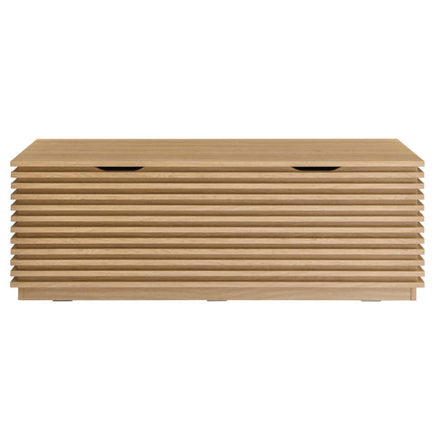 Tap into mid-century aesthetics with the Render Storage Bench. This installment of the Render collection features a durable particleboard frame with a smooth wood grain laminate and retro slatted detail. With a hinged top, this versatile accent bench features a solid construction with a pleasing look and practical functionality. Perfect for the living room, bedroom, entryway, or mudroom, this 47" bench offers ample storage space for linens, clothes, blankets, or whatever else suits your needs. Includes cutouts as a safety measure. Assembly required.