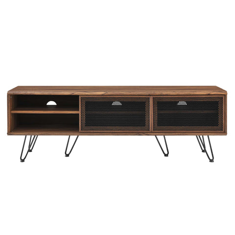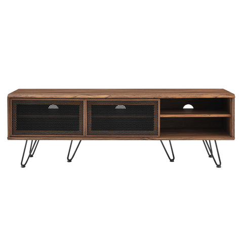 Urbanize your living space with the modern style of the Nomad 59" TV Stand. Featuring two sliding metal mesh doors, this entertainment center brings organic aesthetics and industrial design to the living room, bedroom, home office, or lounge area. This media stand is crafted with a honeycomb core and wood grain laminate. Resting on splayed hairpin legs with non-marking rubber pads, this media stand offers ample storage space for all your media essentials with spacious shelving while cable management holes keep visual space clean and allow for flow-through ventilation. This TV center accommodates TVs up to 65". Assembly required. Weight Capacity: 200 lbs.