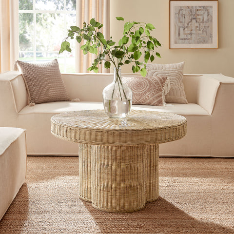 The Ainsley 32" Round Coffee Table adds natural texture and an artful shape to living rooms, sunrooms, and cozy indoor lounges. Made entirely from natural rattan, its sculpted three-pillar base forms a rounded triangle silhouette that feels both organic and architectural—offering more visual interest than a standard pedestal. Topped with a spacious 32-inch surface, this woven accent table is ideal for serving snacks, holding drinks, or displaying your favorite décor. Designed for everyday use, it arrives fully assembled and features non-marking foot caps to help protect floors. Whether styled indoors or on a covered patio, Ainsley brings an easygoing, relaxed vibe to any setup. Product Note: Due to the natural qualities of rattan, slight variations in color and pattern are to be expected, adding to each piece’s unique character.