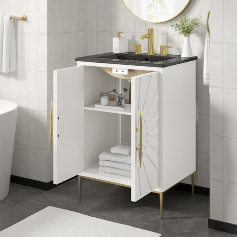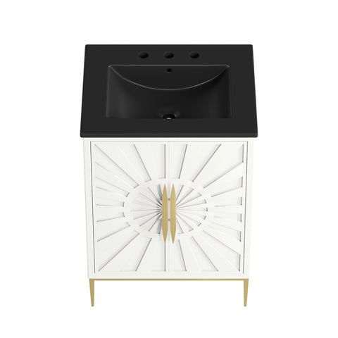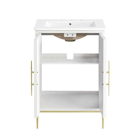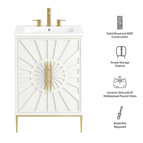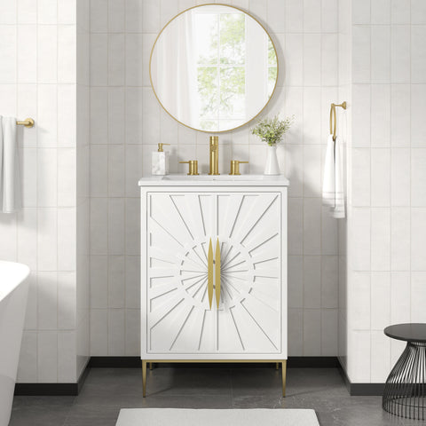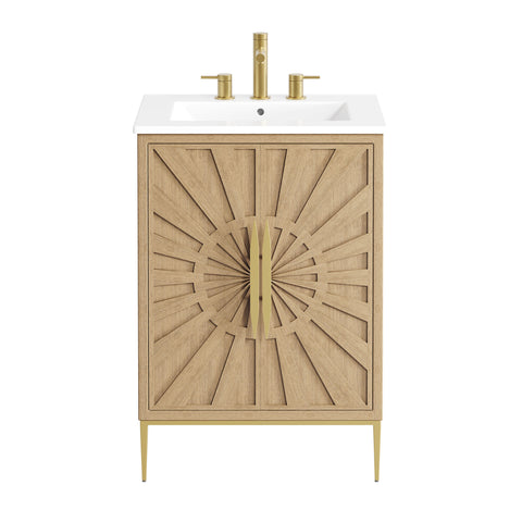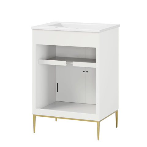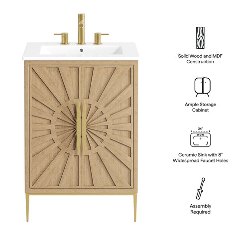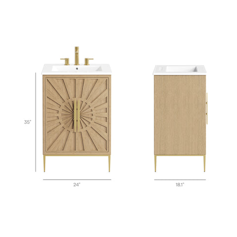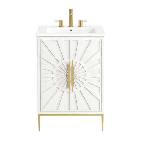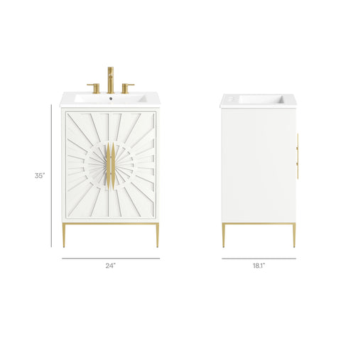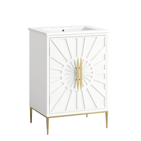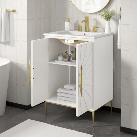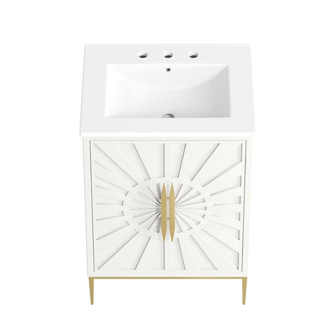 Bring refined modern elegance to your bathroom with the Awaken 24" Bathroom Vanity. The Awaken vanity showcases intricate modernity with clean radial lines crafted from solid wood and durable MDF, resting on a sleek gold base complete with non-marking foot pads to protect your floors. Behind its detailed doors adorned with minimalist gold hardware, you'll find spacious shelves that provide ample storage for all your bathroom essentials. Designed to complement the vanity, the 24" Sink features a rectangular ceramic basin with a narrow integrated countertop and 8-inch widespread faucet holes, delivering a sophisticated look with everyday functionality. Assembly is required.