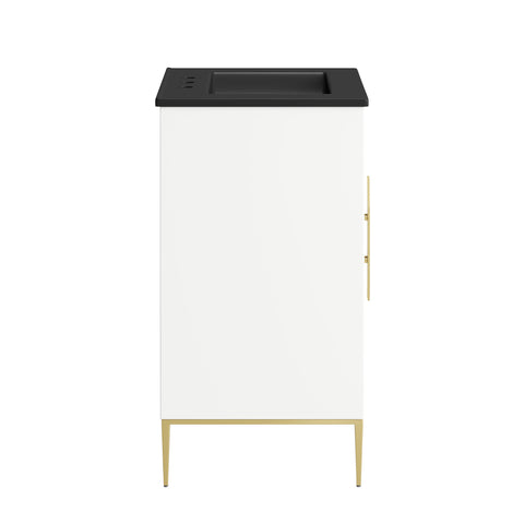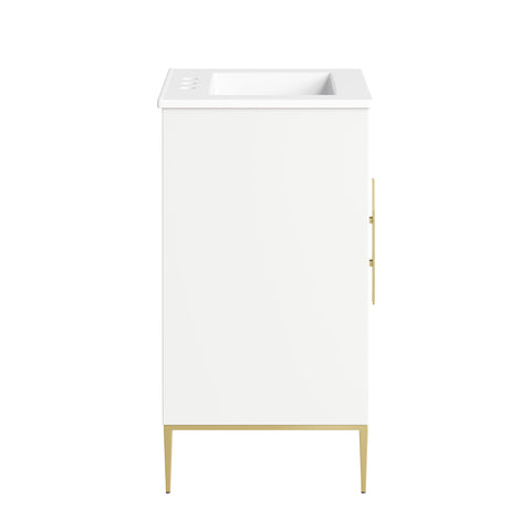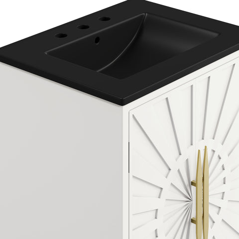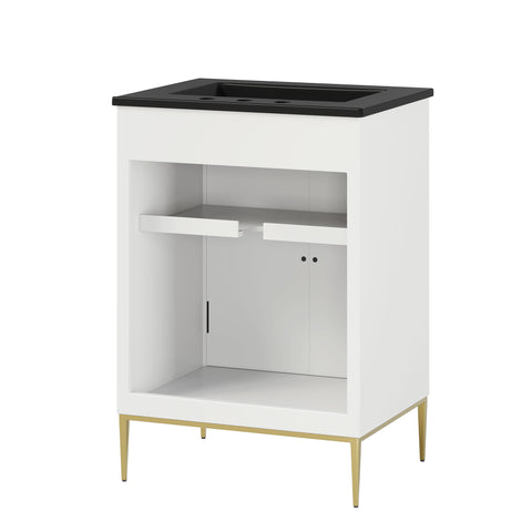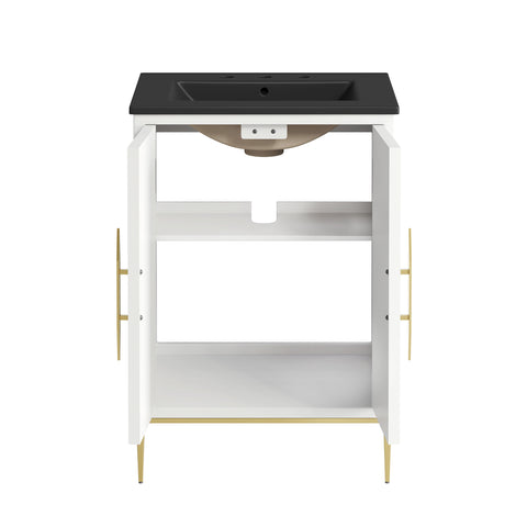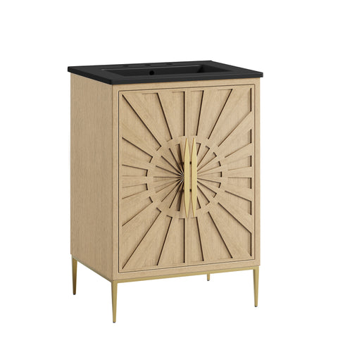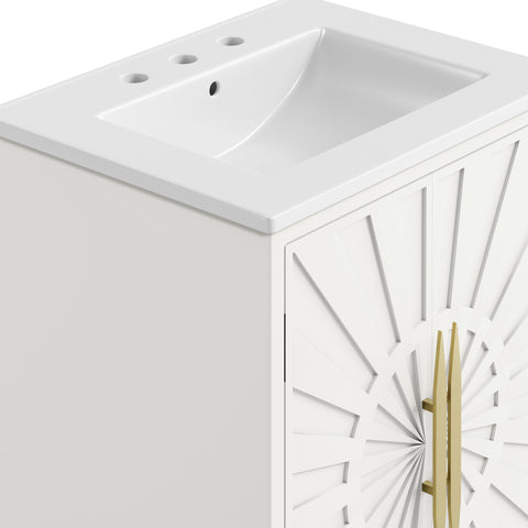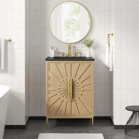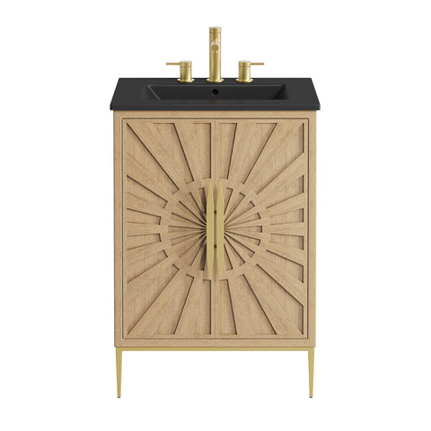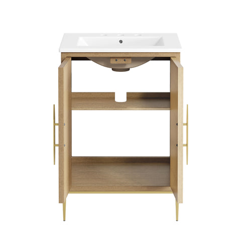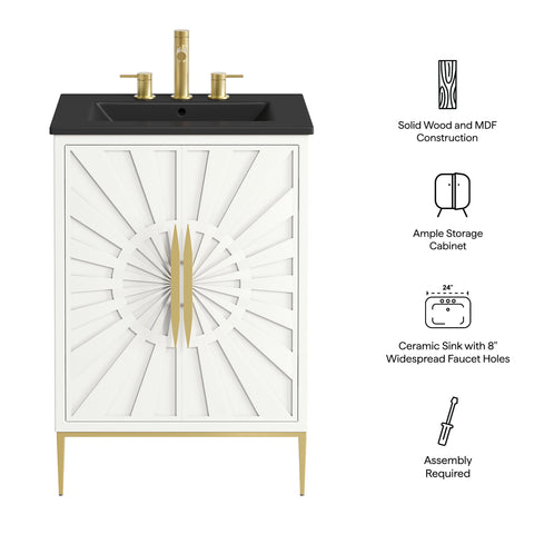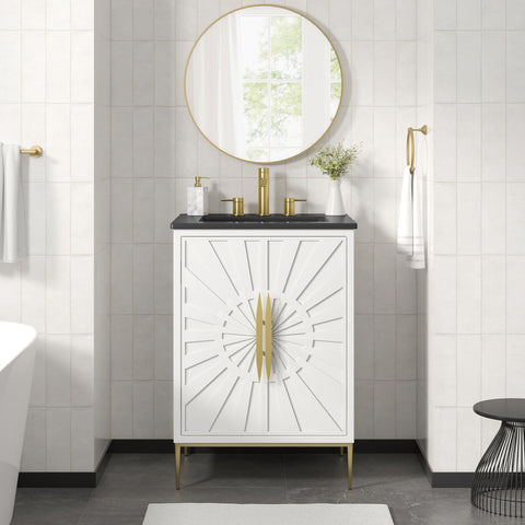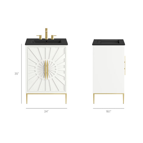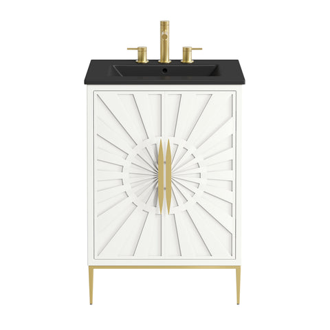 Bring refined modern elegance to your bathroom with the Awaken 24" Bathroom Vanity. The Awaken vanity showcases intricate modernity with clean radial lines crafted from solid wood and durable MDF, resting on a sleek gold base complete with non-marking foot pads to protect your floors. Behind its detailed doors adorned with minimalist gold hardware, you'll find spacious shelves that provide ample storage for all your bathroom essentials. Designed to complement the vanity, the 24" Sink features a rectangular ceramic basin with a narrow integrated countertop and 8-inch widespread faucet holes, delivering a sophisticated look with everyday functionality. Assembly is required.