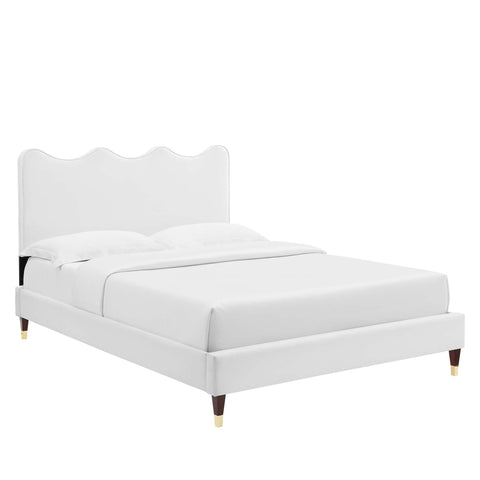 Bring the imagery of waves crashing against the shore to a master bedroom or guest suite with the Current Performance Velvet Queen Platform Bed. Putting a modern twist on a classic scalloped design, the queen headboard of this platform bed features luxe texture and a silhouette inspired by the ocean waves while dense padding offers a supportive place to sit back and relax while sitting up in bed. Covered in stain-resistant performance velvet, this upholstered bed frame is a sturdy mattress foundation for memory foam, innerspring, latex, and hybrid mattresses. Eliminating the need for a box spring, the MDF frame of this queen bed is complete with a wood slat support system crafted with poplar for lasting durability and support. This slatted bed frame rests on wood legs with gold metal sleeves and non-marking foot caps and includes a reinforced center beam with two support legs for enhanced stability. Assembly required. Weight Capacity: 800 lbs.