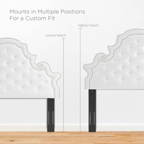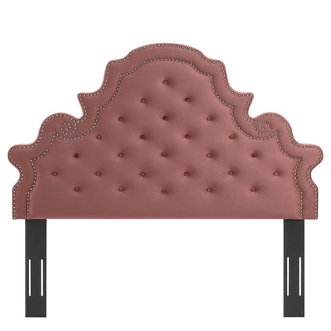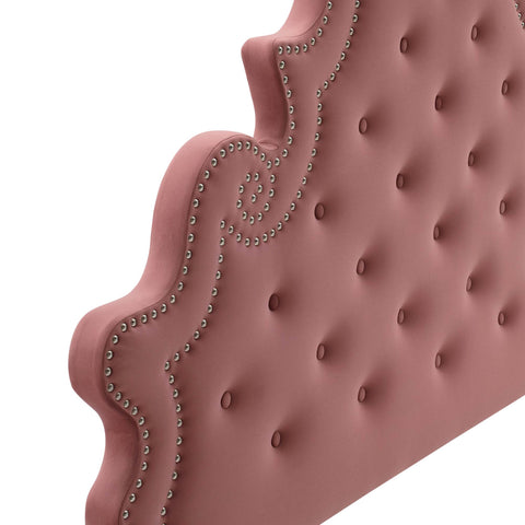 Elaborate details exude regal luxury and vintage glamour on the Diana Tufted Performance Velvet Full/Queen Headboard. Featuring classic button tufting and nailhead trim framing the avant garde silhouette, this full/queen headboard is a stunning addition to a master bedroom or guest bedroom. Upholstered in soft, stain-resistant performance velvet, this padded headboard offers supportive comfort while sitting up in bed reading, relaxing, or watching TV. With various mounting positions, this height-adjustable headboard fits full or queen bed frames. Assembly required.