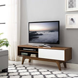 Elevate your entertainment decor with the Envision 48” TV Stand. Featuring an elegant linear silhouette, Envision comes designed with a sliding white door for concealed and open storage space, height adjustable shelves on either side for your game system, DVD or Blu-ray player, and walnut grain laminate over durable fiberboard for reliable support. Supported by flared and tapered legs, update your living room decor while keeping your visual space clean with this versatile TV stand. Accommodates flat screen TVs up to 47 inches.