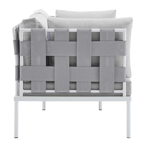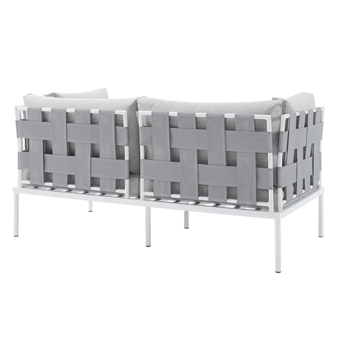 Engage life with Harmony Outdoor Patio Loveseat. Enjoy casual conversation under the open sky with an all-weather waterproof outdoor loveseat from a versatile furniture set that delivers an exceptional outdoor porch, patio, balcony or garden experience. An exceptional modern outdoor furniture set that exceeds expectations, Harmony Patio Two-Seat Sofa comes with silk polyester seat back weave, square powder coated aluminum bases, Sunbrella® cushions, and non-marking foot caps. An outside loveseat that arranges according to the spontaneous needs of your guests, set your sights on open and inspired moments with the Harmony Outdoor Patio Collection.