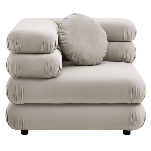 Reimagine your living space with the Jubilee Modular Sectional Sofa with Ottoman, a striking blend of retro flair and modern comfort. With its sleek design, the Jubilee 4-Piece Modular Sofa provides a spacious seating experience without compromising on style. This set includes one ottoman, two corner chairs, and one armless chair that connect with alligator clamp couch connectors, keeping them securely in place or allowing you to separate them as needed. Draped in stain-resistant performance velvet fabric, this comfy sofa exudes a luxurious feel with its dense foam padding and intricate detailing. The thick, gently tufted cushions are arranged in layers, creating a plush, stacked appearance with rounded edges for a cozy feel. The included three round pillows enhance both comfort and vintage charm, making this performance velvet upholstered modular sofa an inviting spot to relax. With premium zigzag spring pocket coils for robust support and comfort, Jubilee is the perfect oversized living room sofa or comfy sectional couch for hours of lounging. Equipped with plastic foot pads to protect your floors, this 4 piece modular sofa with ottoman is the retro fabric couch your modern decor needs. Assembly Required.