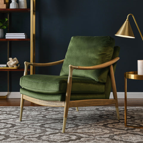 Enhance your living space with the Langford Performance Velvet Living Room Chair, where elegance meets comfort in a timeless mid-century modern design. Upholstered in stain-resistant performance velvet, this accent chair adds a sophisticated touch with its inviting, plush texture and resilient finish. Brass accents on the legs and corners of the swooped armrests bring a refined charm, highlighting the velvet chair’s clean lines and classic structure. Crafted with a solid kiln-dried wood frame, this accent chair with arms is as durable as it is stylish, offering long-lasting support and comfort. Langford's cushions provide a consistent look and feel, ensuring this modern armchair remains as cozy as it is chic. Perfect for reading nooks, living rooms, or as a striking bedroom accent, the Langford Reading Nook Chair combines mid-century modern flair with modern functionality. Assembly required, with clear instructions provided for an easy setup. Weight Capacity: 300 lbs.