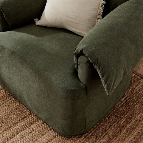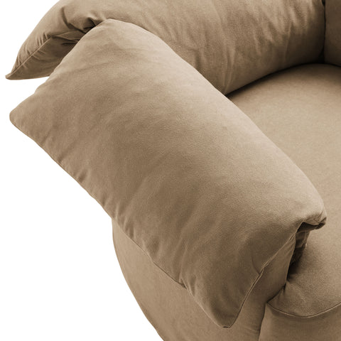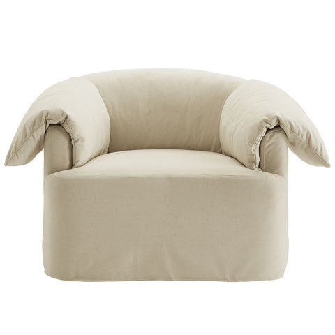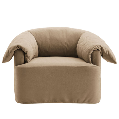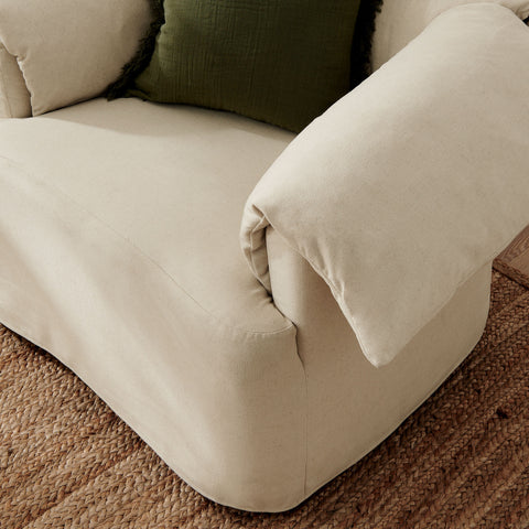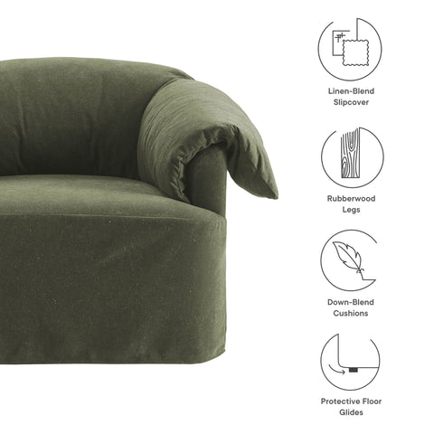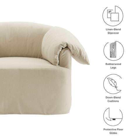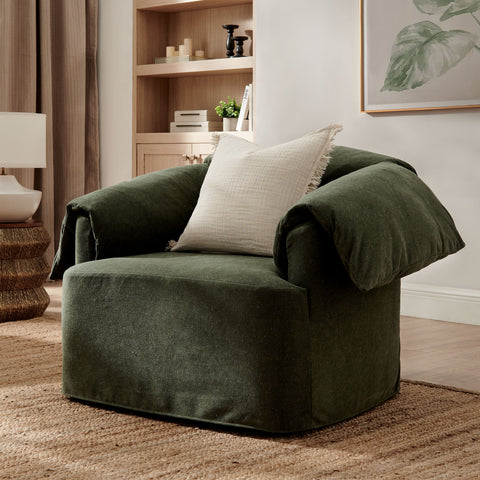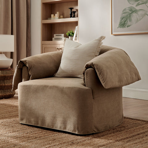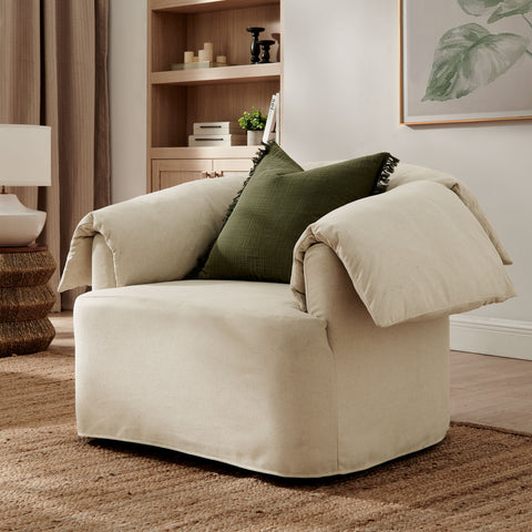 The Lark Oversized Accent Chair brings contemporary elegance and unrivaled comfort to your living room, bedroom, or cozy corner. Wrapped in linen-blend fabric upholstery, this modern lounge chair features an inviting, oversized design with plush down-blend cushions that drape elegantly over the sloping arms. The tailored design and an updated barrel chair silhouette add refined sophistication, while the removable slipcover and cushion covers make it easy to maintain. The deep seat and generously padded cushions, supported by durable sinuous springs, offer luxurious comfort for relaxing, reading, or lounging. Perfect as a living room accent chair, reading chair, or oversized lounge chair, Lark blends versatility and style. This oversized armchair requires no assembly and includes non-marking floor glides for floor protection. Weight Capacity: 330 lbs.