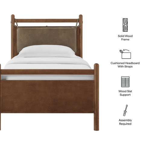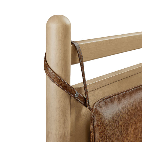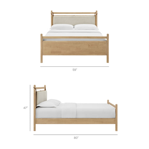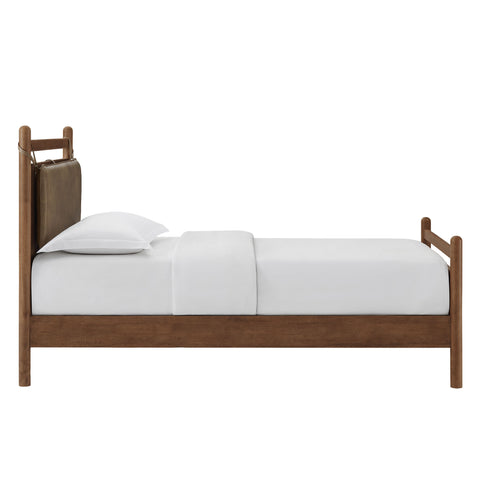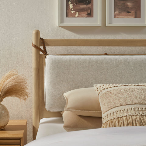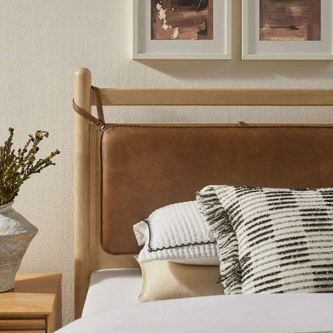 The Leni Queen Platform Bed has a clean, relaxed profile with gently rounded lines. Crafted from solid wood this queen size bed frame features sturdy wooden slats that support your mattress without the need for a box spring. At the head of the bed, a heathered fabric pillow hangs from faux leather straps to create an upholstered headboard that adds padding and a comfortable spot for reading or evening wind-downs. The simple footboard and rounded posts keep the silhouette easy to style, pairing well with a range of bedding and decor from primary bedrooms to guest rooms. This solid wood bed frame with headboard offers stable support night after night with an 800 lb weight capacity.