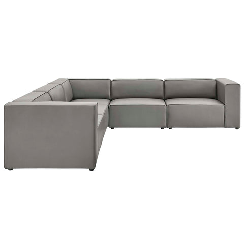 Kick back and relax with the Mingle Vegan Leather 5-Piece Sectional Sofa. Designed to wash away the hindrances that obstruct visual space, this sectional sofa set comes expansively designed with generous seating and dense foam padding that allows for just the right amount of giving. Mingle easily positions according to the needs of the moment and features rich vegan leather upholstery with elegant piping and plastic legs for steady support. Host animated living or lounge room get-togethers with a modular sectional sofa seating assortment perfect for contemporary modern décors. Set Includes: Left-Arm Chair, Right-Arm Chair, Corner Chair, 2 Armless Chairs