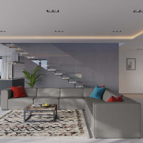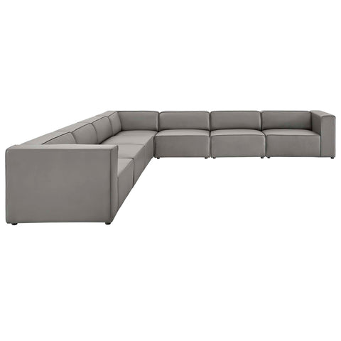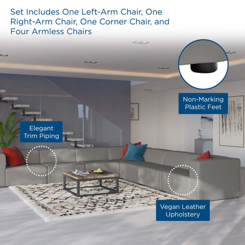 Kick back and relax with the Mingle Vegan Leather 7-Piece Sectional Sofa. Designed to wash away the hindrances that obstruct visual space, this sectional sofa set comes expansively designed with generous seating and dense foam padding that allows for just the right amount of giving. Mingle easily positions according to the needs of the moment and features rich vegan leather upholstery with elegant piping and plastic legs for steady support. Host animated living or lounge room get-togethers with a modular sectional sofa seating assortment perfect for contemporary modern décors. Set Includes: 1 Left-Arm Chair, 1 Right-Arm Chair, 1 Corner Chair, 4 Armless Chairs