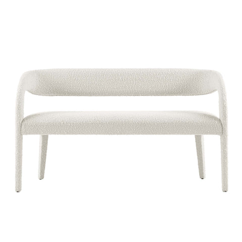 Experience the perfect blend of modern sophistication and luxurious comfort with the Pinnacle Boucle Fabric Upholstered Accent Bench. Whether used as a dining bench or accent bench, its distinct silhouette showcases a curved backrest and an open design that effortlessly enhances your dining or living space with luxe style. This modern bench indulges your senses with its dense foam padding, upholstered in a tactile, nubby textured boucle fabric. Non-marking plastic foot pins ensure your flooring remains free from scuffs and scratches. With no assembly required, this bench offers a stylish statement instantly. Weight Capacity: 330 lbs.