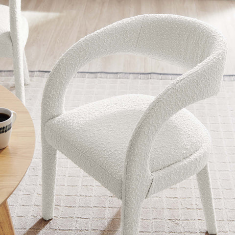 Experience the perfect blend of modern sophistication and luxurious comfort with the Pinnacle Boucle Upholstered Dining Chair Set of Two. The distinct silhouette showcases a curved backrest and an open design that effortlessly enhances your dining or living space with luxe style. This dining chair set indulges your senses with its dense foam padding, upholstered in a tactile, nubby textured boucle fabric. Non-marking plastic foot pins ensure your flooring remains free from scuffs and scratches. With minimal assembly needed, this set not only offers a stylish statement but also a hassle-free setup. Weight Capacity: 330 lbs.