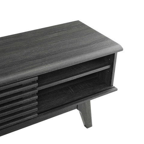 Elevate your entertainment decor with the Render 70" Media Console TV Stand. Featuring an elegant mid-century silhouette, Render comes with two sliding white doors for versatile concealed and open storage space, and a full-extension center glide drawer with cable management for spacious media storage. Made of durable particleboard and MDF with walnut grain veneer and flared and tapered legs, store your game system, DVD or Blue-ray player in style while keeping your visual space clean with this versatile media console TV stand. Render accommodates flat screen TVs up to 78 inches.