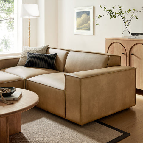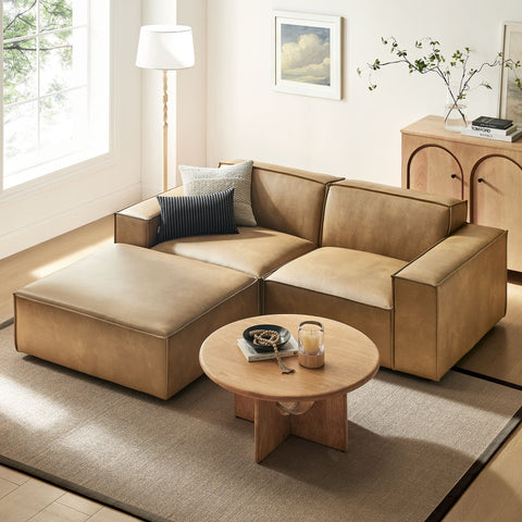 Create your custom living room and lounge area with the Restore Vegan Leather 3-Piece Sectional Sofa Set. The Restore Sectional Sofa appeals to minimalist elegance with a crisp design and broad lines accented with French piping details and soft faux leather upholstery. Dense foam padding and a pocket coil spring system in the cushions offer a luxe seating experience for your living room and lounge. Complete with a matching modular ottoman, this loveseat couch can be arranged together for laid-back lounging, used as separate pieces, or expanded over time by connecting with other Restore pieces using the built-in connectors. Built on a sturdy wood-blend frame with non-marking foot caps to help protect floors.