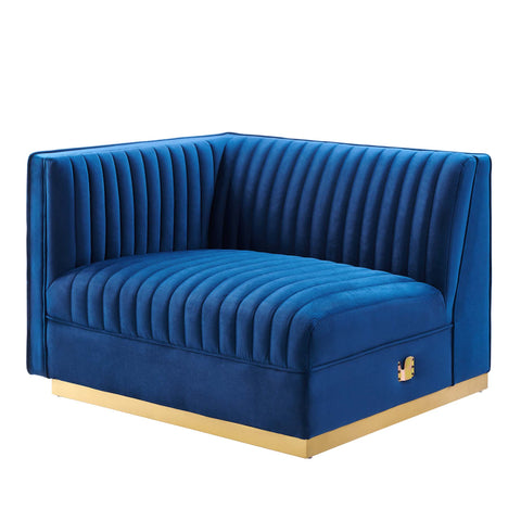 Glamour radiates from the organic linear design of the Sanguine Channel Tufted Performance Velvet Modular Sectional Sofa Left-Arm Chair. Relax and follow the vertical channel tufting for a streamlined look that adds retro modern glamour to your living room, lounge, or home office. Soft, stain-resistant performance velvet upholstery creates a luxurious tactile experience while dense foam padding and an individually wrapped spring coil system provide ultimate comfort and support for this sectional sofa piece. Solidly constructed from eucalyptus wood and plywood, this sectional sofa collection is an eye-catching addition. Sanguine's palatial accents and premium comfort rest securely on a gold stainless steel base that complements any contemporary modern home or apartment. Includes non-marking foot pads to protect flooring. Weight Capacity: 330 lbs.