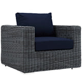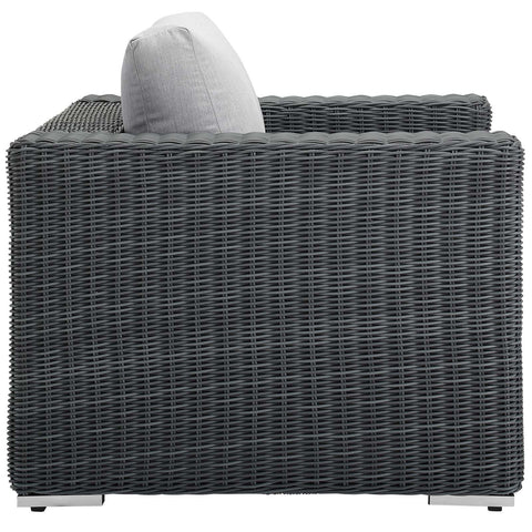 Experience the outdoors with exceptional comfort and quality. Summon Outdoor Patio Arm Chair offers an exquisite two-tone synthetic rattan weave, plush all-weather cushions with industry-leading Sunbrella® fabric, UV protection, and a sturdy powder-coated aluminum frame. Featuring an elegant modern look, Summon Patio Arm Chair is part of an avant-garde outdoor sectional series well-equipped for enhancing patio, backyard, or poolside gatherings. This installment of the series is an Outdoor Patio Arm Chair.