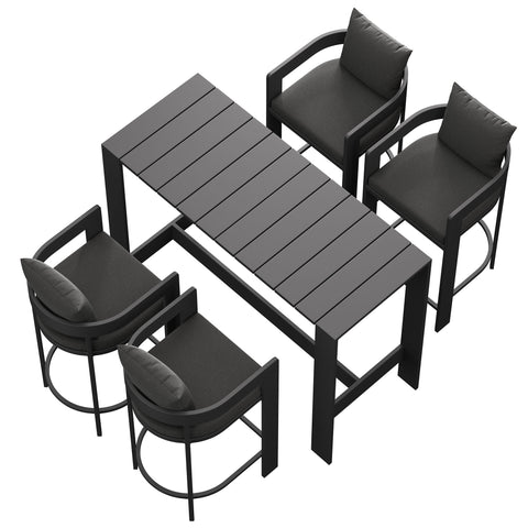 Enliven your alfresco spaces with the Tahoe Outdoor Patio 5-piece Bar Set. Built with durable aluminum frames and finished in a smooth powder-coated finish, this bar table and chairs set brings a clean, modern look to outdoor spaces. The set includes one rectangular bar-height table and four matching bar chairs for drinks, casual meals, and easy conversation. Featuring a slatted tabletop with smooth edges and coordinating slatted chair seats, Tahoe wipes down easily and stays simple to maintain. With easy assembly and adjustable plastic foot pins to help keep it level on uneven surfaces, this patio bar set is made for everyday outdoor dining and gatherings. Table Weight Capacity: 221 lbs. Chair Weight Capacity: 300 lbs. Each.