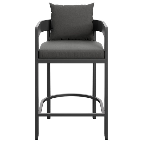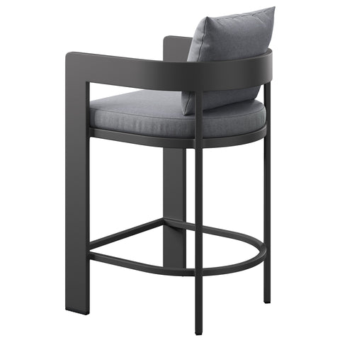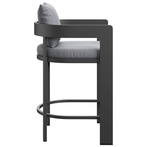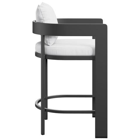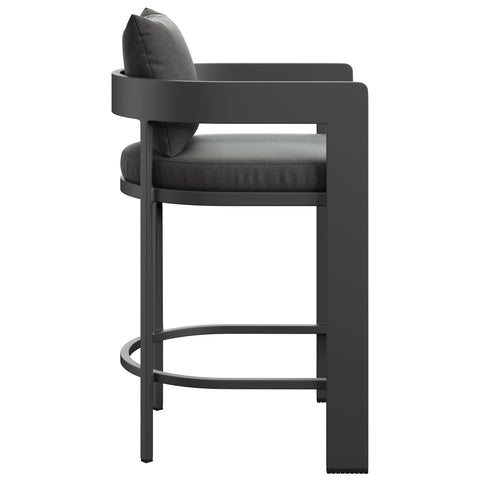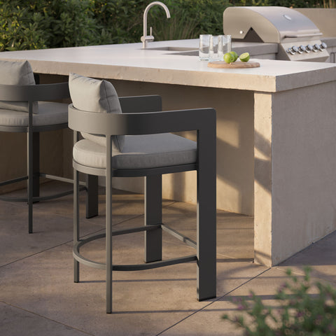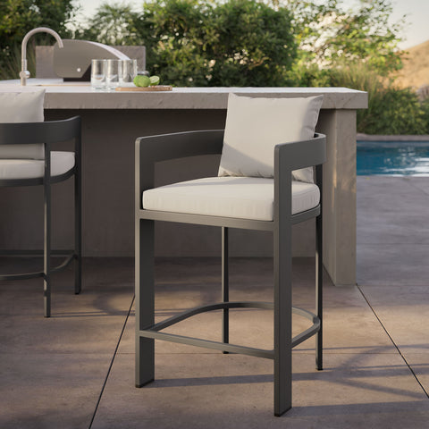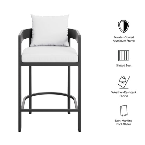 "Enliven your alfresco spaces with the Tahoe Aluminum Outdoor Patio Counter Height Stool. This counter-height outdoor stool is made from powder-coated aluminum with a clean, modern profile for patios, decks, and backyard entertaining. Featuring a curved back, a slatted seat, and a wraparound stretcher for foot support, Tahoe also comes with removable seat and back cushions filled with dense foam and covered in sunproof, water-resistant fabric. Whether paired with a Tahoe patio table or mixed with other outdoor tables, this barrel-style stool offers a comfortable place to enjoy morning coffee, casual meals, or evening drinks. Equipped with non-marking foot glides to help protect patio and deck flooring, Tahoe comes fully assembled. Weight Capacity: 300 lbs."