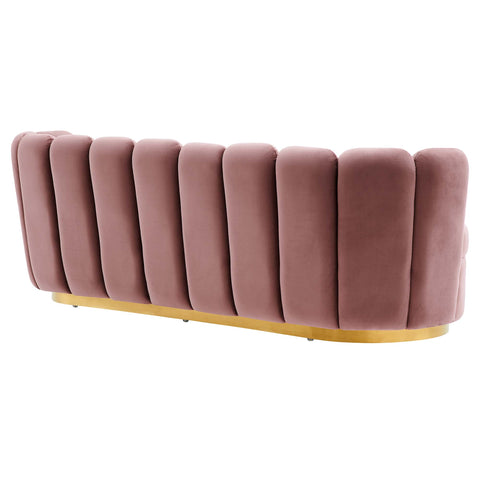 Defined by bold vertical channel tufting and a scalloped edge, the Victoria Performance Velvet Sofa resonates with retro glam appeal in mid-century modern or eclectic decors. Create an inspired setting in your living room, bedroom, or lounge area with this velvet sofa, featuring dense foam padding and a webbed support system for superior comfort. The Victoria Sofa conveys the essence of a modern heirloom piece, features an inset gold metal rim and artfully upholstered stain-resistant performance velvet. This sturdy couch comes equipped with non-marking foot glides to protect your floor. Sofa Weight Capacity: 993 lbs.